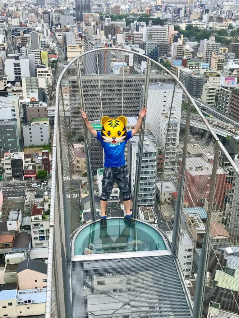 また、跳ね出し展望台《TIP THE TSUTENKAKU》=地上92.5m、長さ5.4m、幅1.5mは先端部分がシースルーフロアになっていて下が丸見えなので、なかなかスリルな体験を味わえます。