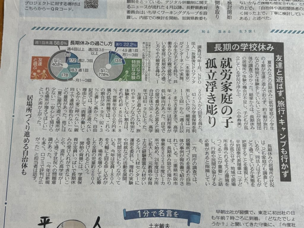 子供が孤立しないように、長期休みの時は地域で《学童》や《子供食堂》など、居場所をつくることが大切だと自治体も考えているようです。