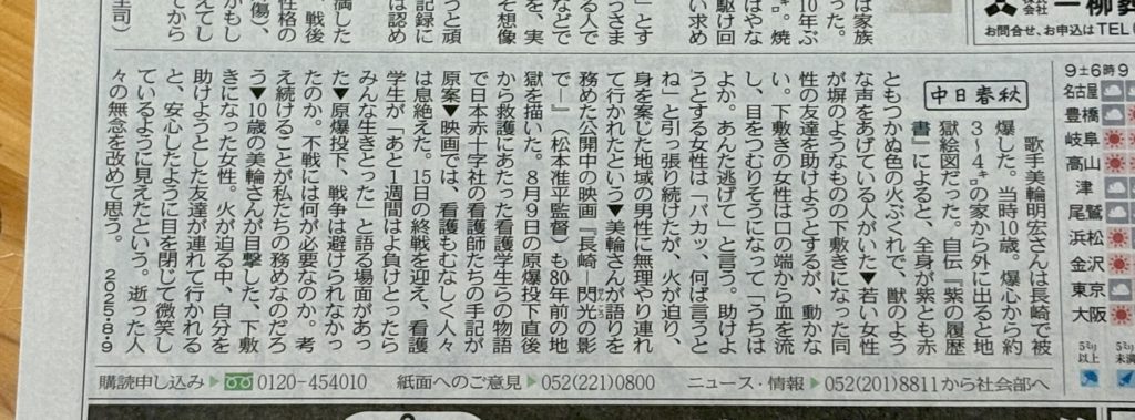 でも、今日の中日新聞のコラム《中日春秋》に書いてあった話を読んで、最後の6行で私は涙が止まらなくなりました。そして《戦争の犠牲者》を二度と出さないようにしないと!と再認識しました。