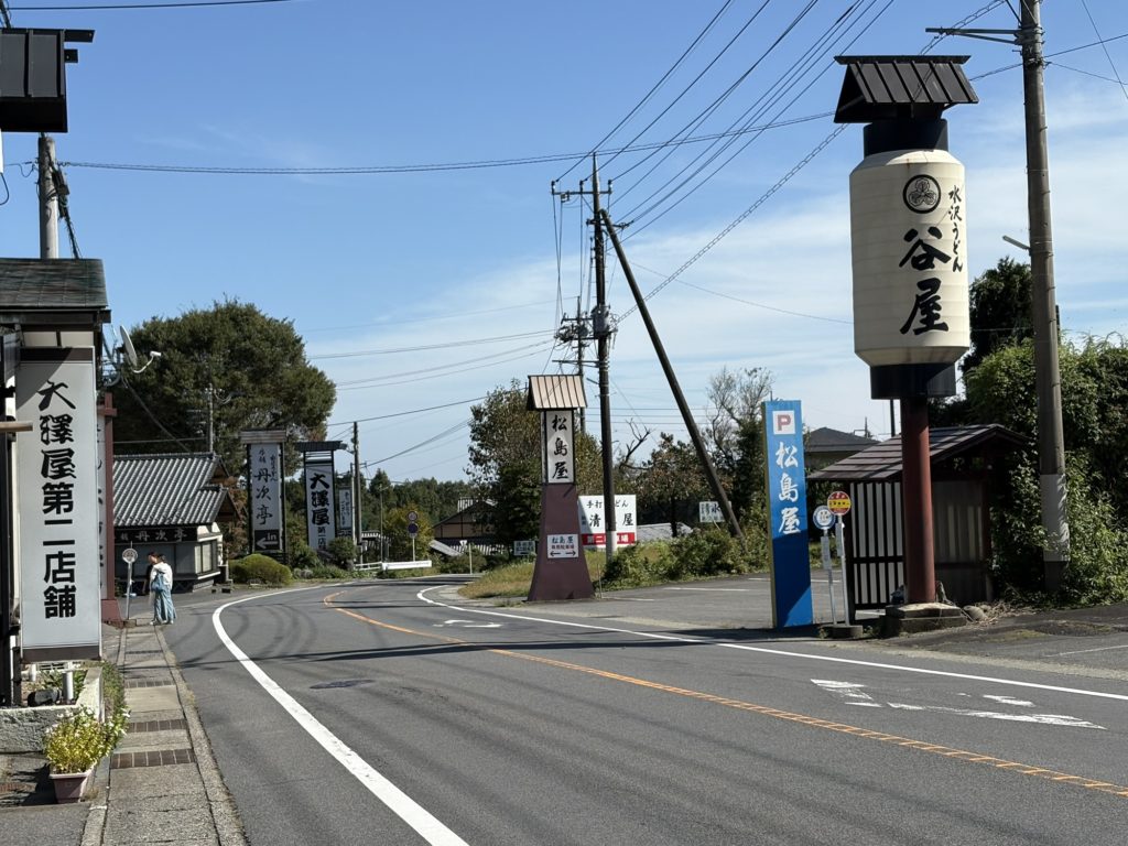 仁王門を抜けると水沢うどんのお店が並ぶ道に出ます。