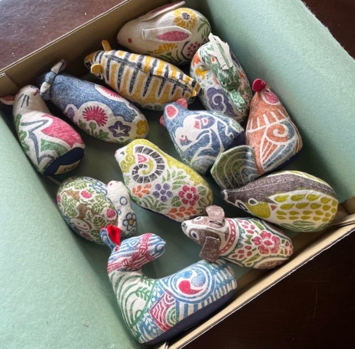 それは何かといいますと《木版手染めぬいぐるみ》です。…『はぁ、なに?それ』ですよね。