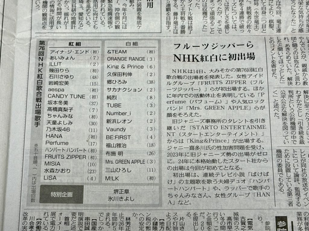 11月も折り返し。昨日の新聞に、今年の《NHK紅白歌合戦》の出場者が載っていました。↓↓↓
