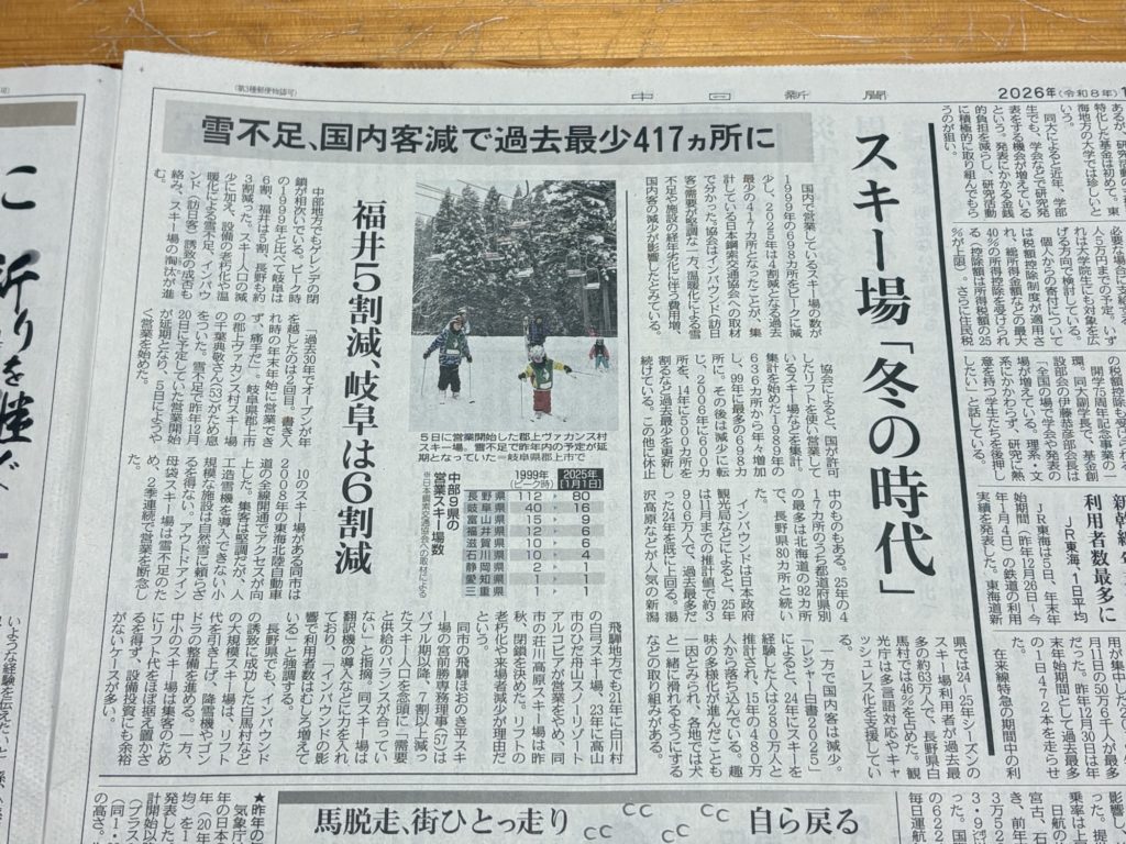 今日の中日新聞の朝刊に『スキー場《冬の時代》雪不足・国内客減で過去最少417ヶ所に』という記事が載っていました。↓↓↓
