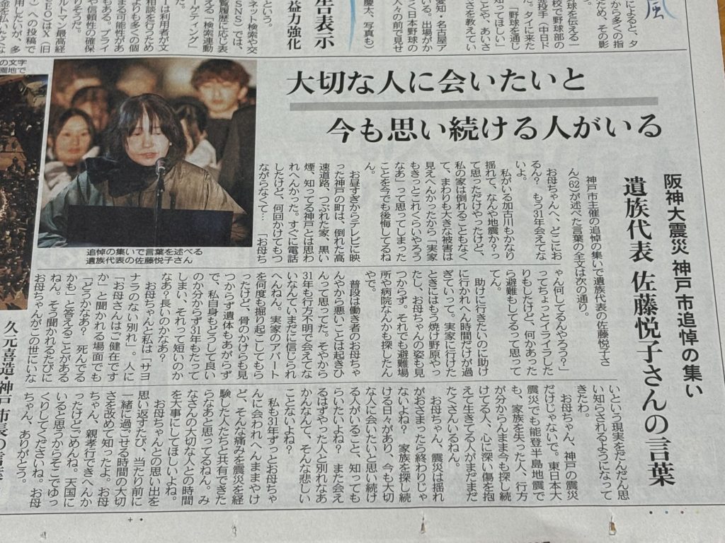 神戸市追悼の集いで、遺族代表の方が述べた言葉が今朝の新聞に載っていました。