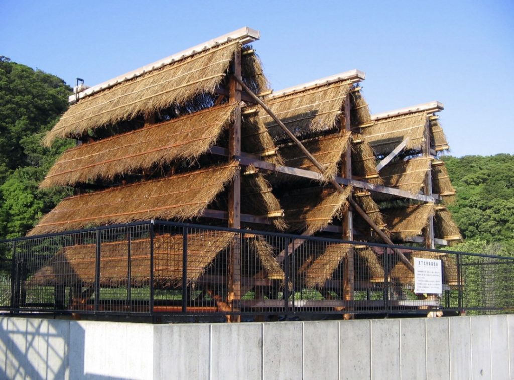 この《茅葺き屋根》が重なったようなモノは、昔から伝わる製塩技術である《流下式 枝条架塩田(りゅうかしき しじょうかえんでん)》という仕掛けです。